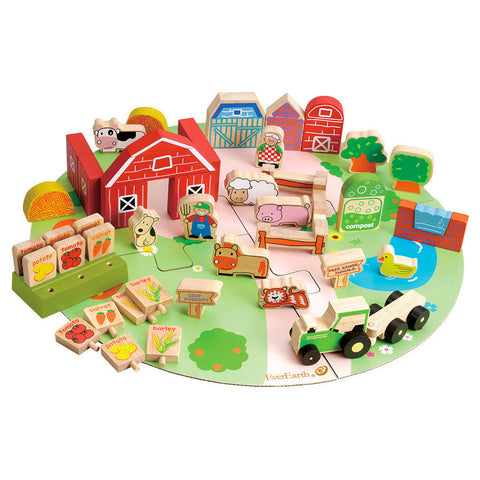Our lively, bustling, organic farm is the perfect place to learn about the animals your child loves. A huge number of parts mean imaginative play is endless, including stable, barns, vegetable patch, farmer doll, dog, cow, cat, duck and pond, pig, sheep, crops and combine harvester. Fully collapsible base for easy storage.